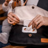 Um Schmutz zu entfernen, wischen Sie die Tasche einfach mit einem feuchten, weichen Mikrofasertuch ab. Auch für Kinder entwickelte Feuchttücher sind geeignet. Bei hartnäckigerem Schmutz kann eine milde Seifenlösung verwendet werden. Nicht zum Waschen in der Waschmaschine oder zum Einweichen geeignet. Lassen Sie sie an der natürlichen Raumluft trocknen und legen Sie die Tasche an einen schattigen Ort, wo sie keiner direkten Sonneneinstrahlung ausgesetzt ist.